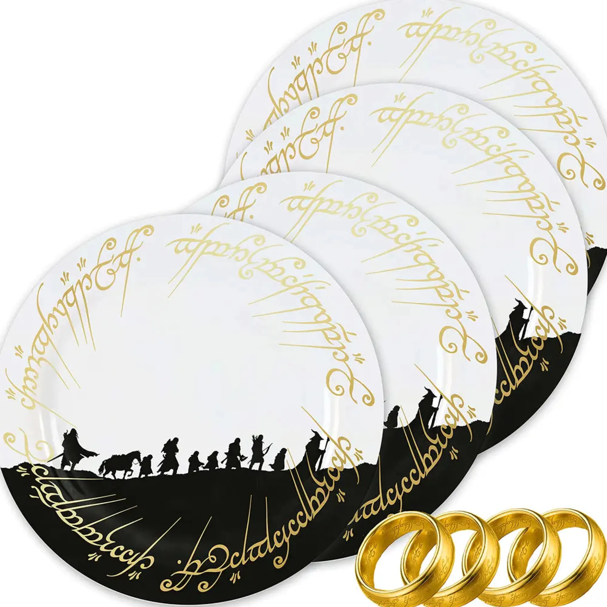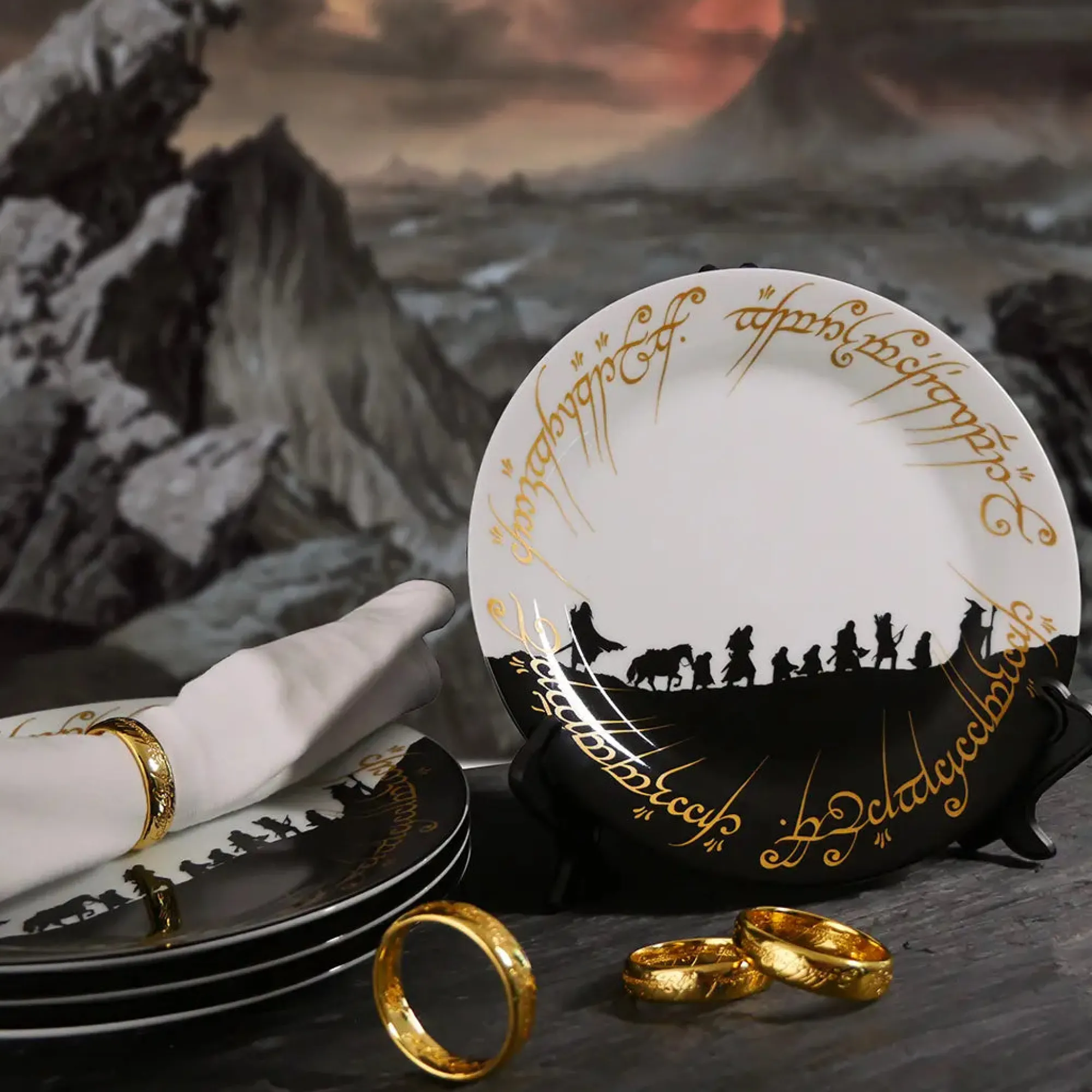 Das Set besteht aus vier hochwertig verarbeiteten Keramiktellern mit einem Durchmesser von 21 cm, verziert mit goldglänzender Elbenschrift und der ikonischen Silhouette der Gefährten auf schwarzem Untergrund. Diese edle Gestaltung macht sie nicht nur zu einem echten Blickfang, sondern auch zu einem Must für Fans von J.R.R. Tolkien – ganz gleich, ob zum Sammeln, Dekorieren oder Benutzen. Ergänzt wird das Ganze durch vier goldene Serviettenringe in Form des Einen Rings – mit Gravur in der Schwarzen Sprache von Mordor, versteht sich.