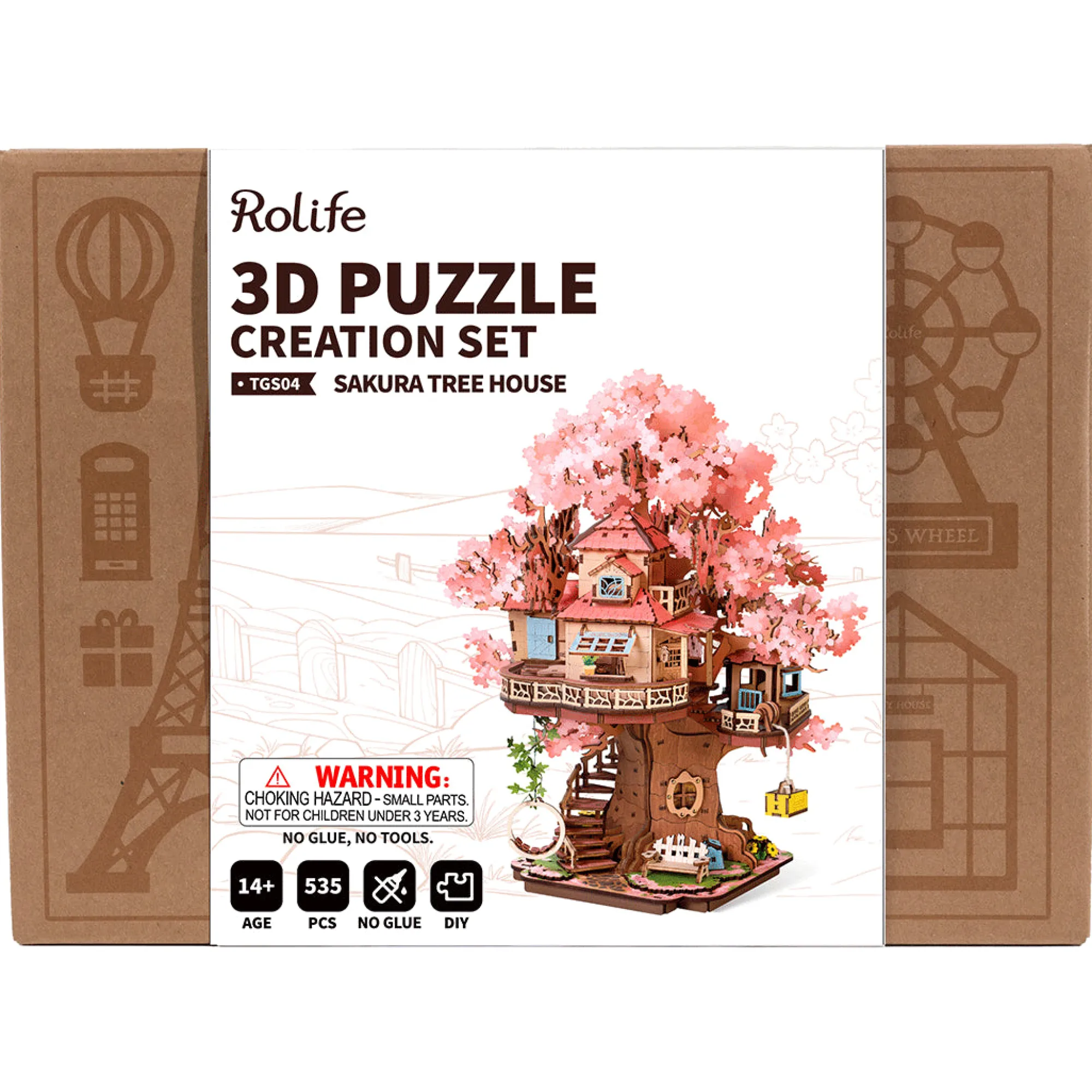Mit 535 filigranen Einzelteilen aus hochwertigem Holz und ohne den Einsatz von Kleber lässt sich das Baumhaus in etwa 5 Stunden zusammenstecken. Dabei sorgen Zapfenverbindungen für stabilen Halt. Rotierende Treppen, ein schwenkbarer Aufzugskorb, eine kleine Veranda und eine Doppelloft-Etage sorgen nicht nur für visuelle Highlights, sondern auch für jede Menge liebevoller Details. Der fertige Bausatz misst ca. 30 x 24 x 31 cm und bietet eine stabile, farbenfrohe Konstruktion, deren UV-Druck auch nach Jahren noch leuchtet.