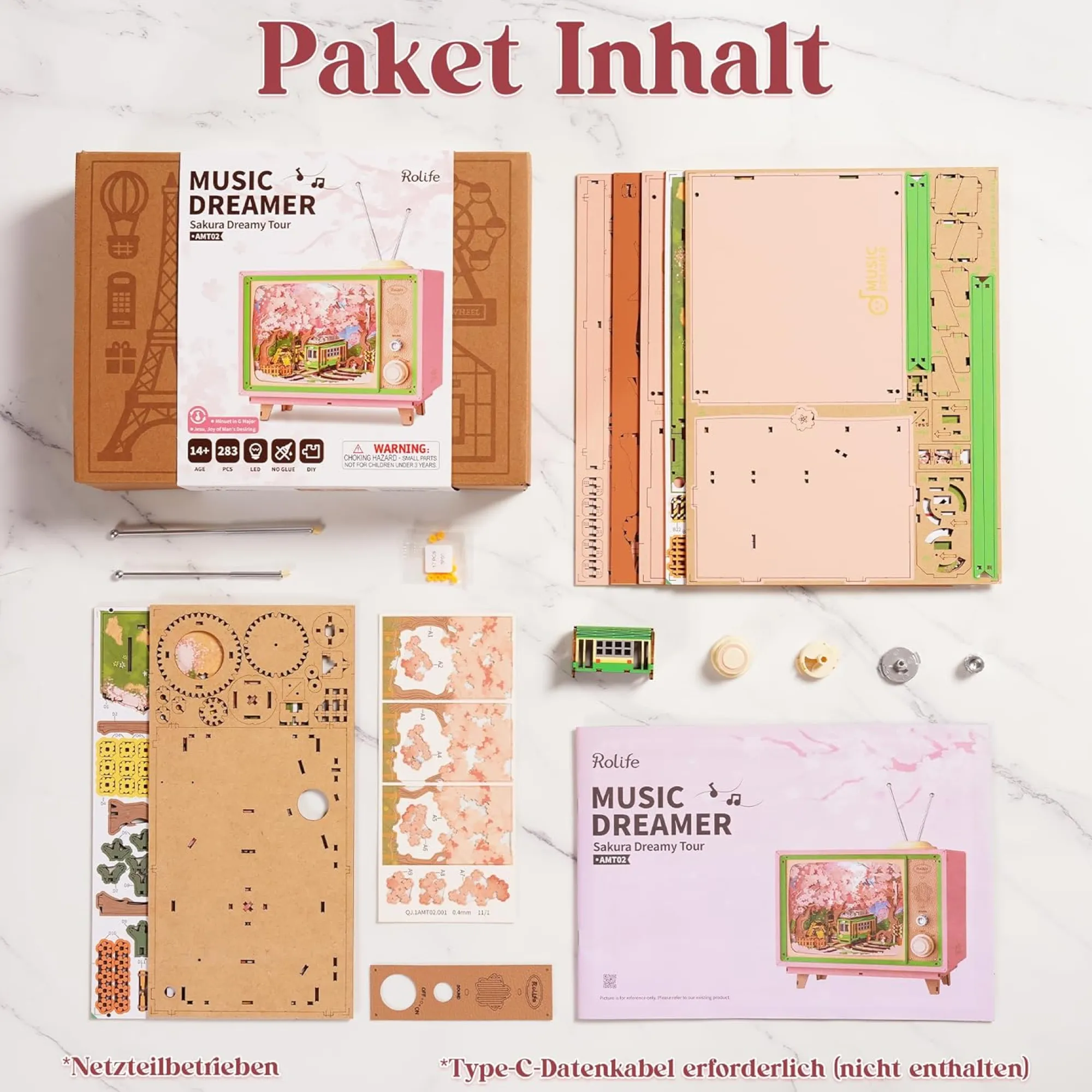 Der Bausatz besteht aus 283 präzise gefertigten Teilen und wird ohne Klebstoff über ein cleveres Stecksystem zusammengesetzt. Die elektrische Funktion wird über ein USB-C-Kabel (nicht enthalten) betrieben – eine nachhaltige Alternative zu Batterien. Mit einem Drehknopf steuerst du zwei klassische Musikstücke (Menuett in G-Dur und Jesu, Freude schöner Seelenlust), ein sanftes Stimmungslicht und die Bewegung der Bahn.