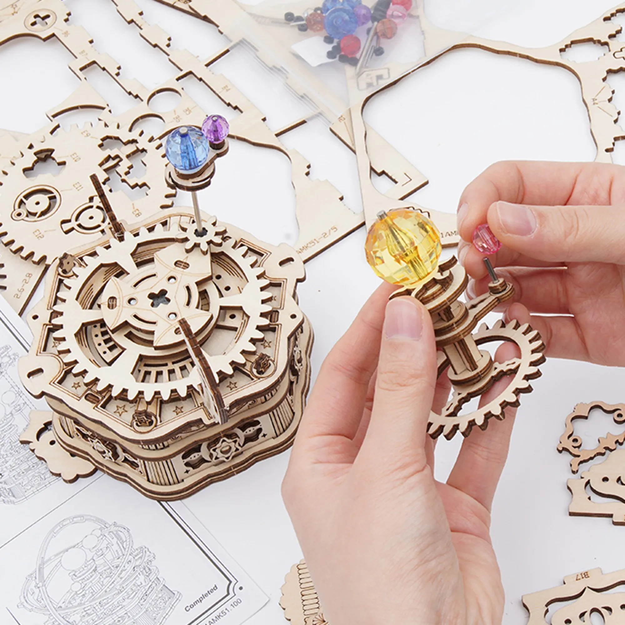 Daher liegt es wohl nahe, eine Spieluhr und ein sogenanntes Orrery – ein mechanisches Modell, das die Umlaufbahn der Planeten zeigt – zu kombinieren. Und das Beste daran ist, dass du es dir selbst zusammenbauen kannst! Der Sternennacht Mechanische Spieluhr Holzbausatz besteht aus 84 vorgestanzten Holzteilen und diversen Metallteilen, die ohne zusätzliches Werkzeug und komplett ohne Klebstoff zusammengebaut werden können. Du brauchst dafür lediglich die beiliegende englische Anleitung, etwas Fingerspitzengefühl und Geduld.