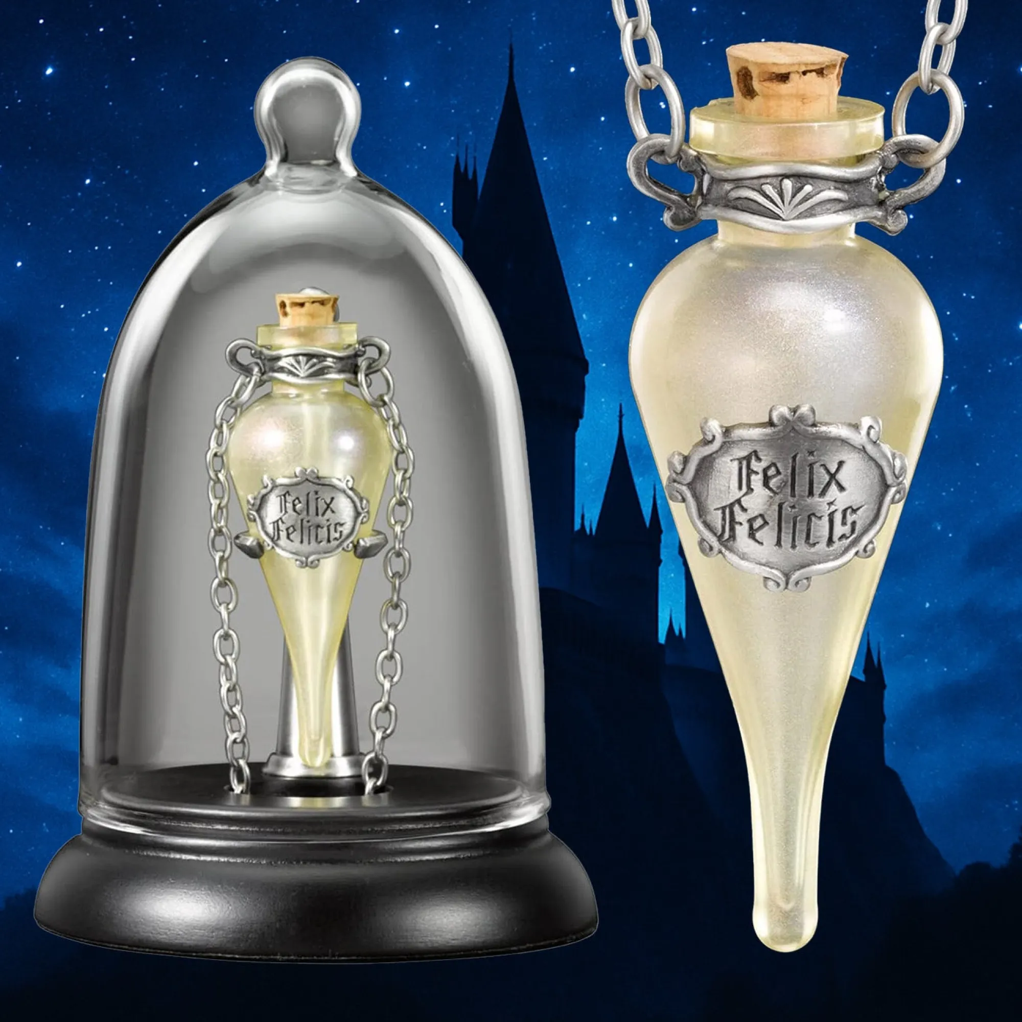 Die ca. 6cm hohe Phiole aus echtem Glas schimmert perlmuttartig und trägt ein detailverliebtes Felix-Felicis-Schild. Sie hängt an einer 18Zoll (ca. 45cm) langen Metallkette und wird in einer edlen Sammler-Vitrine aus Glas und Holz geliefert, die das Schmuckstück stilecht präsentiert. Die gesamte Ausführung stammt von The Noble Collection – bekannt für ihre hochwertigen lizenzierten Filmrepliken – und bringt sowohl filmgetreues Design als auch magisches Flair mit sich.