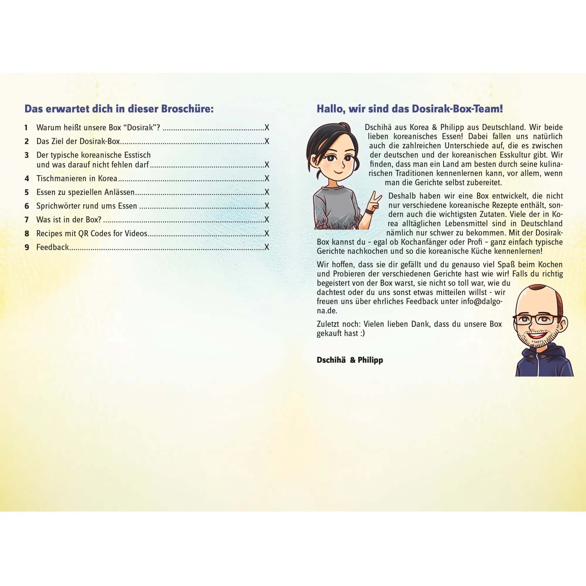 Ob Japchae, Budae Jjigae oder Bibimbap – mit der Dosirak-Box kannst du diese und 22 weitere Gerichte ganz einfach zuhause nachkochen! In der Box findest du ein 100-seitiges (!) Kochbuch, das von Dschihä, der koreanischen Frau unseres Chefs, erstellt wurde. Es enthält 25 Rezepte und spannende Hintergrundinfos zur Esskultur in Korea und den einzelnen Gerichten.