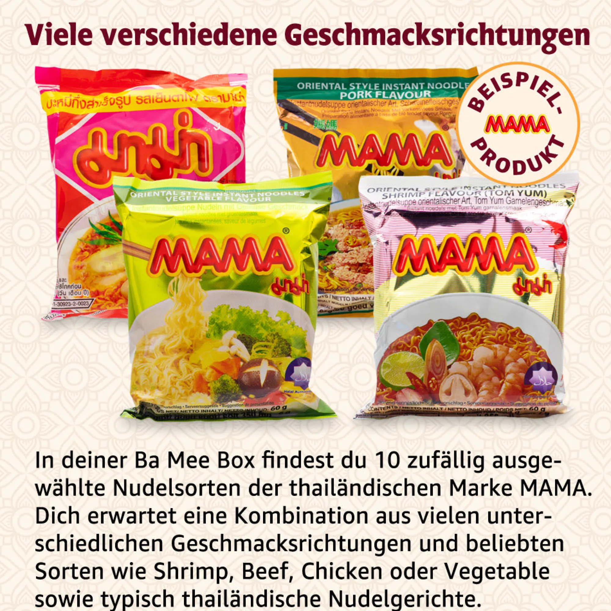 Von insgesamt 15 MAMA-Sorten wählen wir zehn Stück für deine Box zufällig aus. Dabei achten wir darauf, dass du eine ausgewogene Variation der verschiedenen Geschmacksrichtungen erhältst. Deswegen bekommst du sowohl thailändische Klassiker, wie beispielsweise Shrimp, Huhn, Gemüse oder Green Curry, als auch besondere Spezialitäten, wie Moo Nam Tok, oder Pad Kee Mao. Von jeder dieser zehn Sorten sind jeweils drei Packungen in der Box, sodass du insgesamt 30 Packungen Instant-Nudeln bekommst!