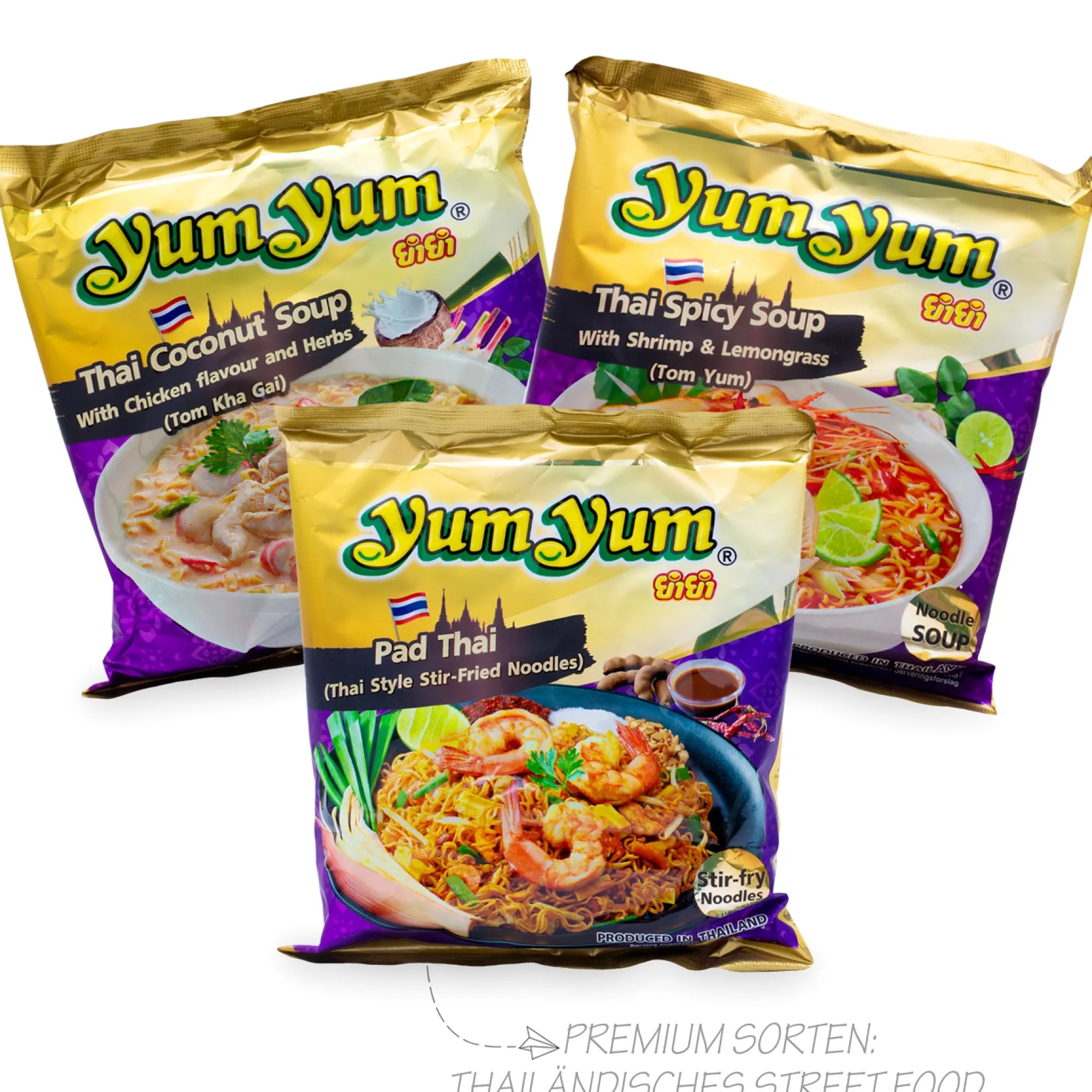 Von insgesamt 16 Yum-Yum-Sorten wählen wir zehn Stück für deine Box zufällig aus. Dabei achten wir darauf, dass du eine ausgewogene Variation der verschiedenen Geschmacksrichtungen erhältst. Deswegen bekommst du sowohl Ramen-Klassiker, wie beispielsweise Shrimp, Huhn oder Gemüse, als auch beliebte thailändische Gerichte wie Green Curry, Pad Thai oder Thai Spicy Soup. Von jeder dieser zehn Sorten sind jeweils drei Packungen in der Box, sodass du insgesamt 30 Packungen Instant-Nudeln bekommst!
